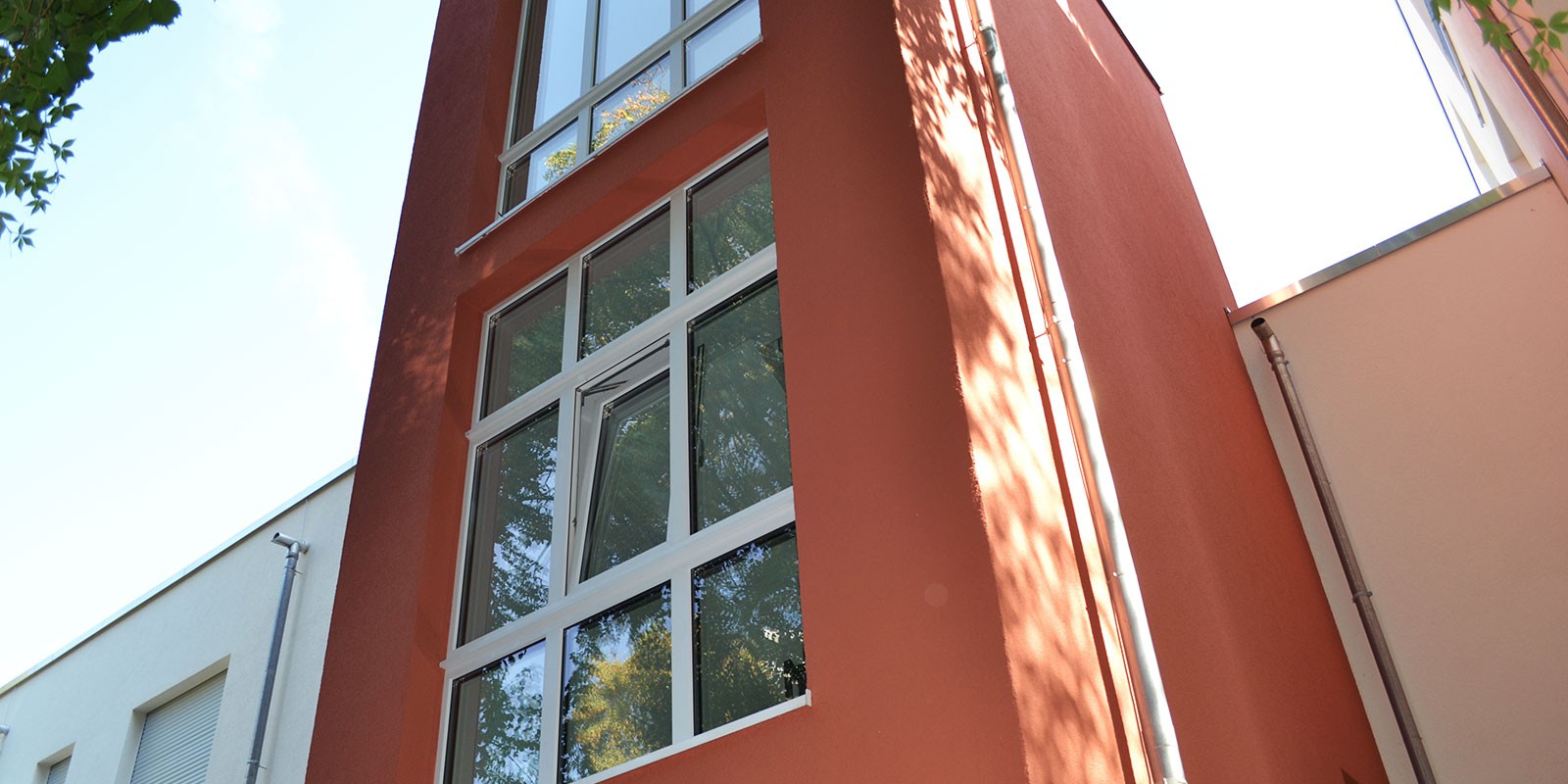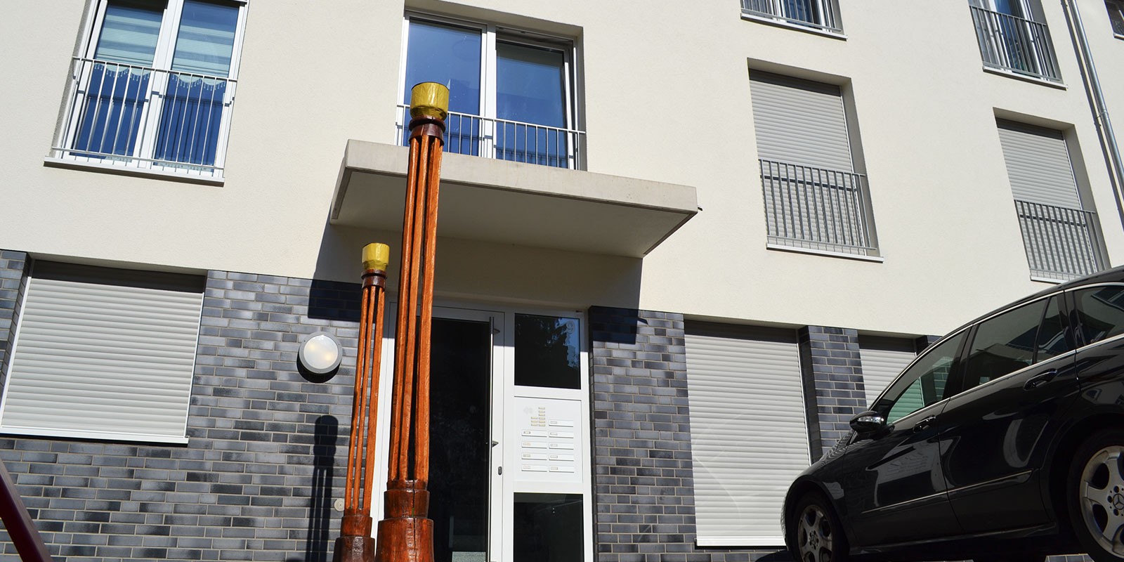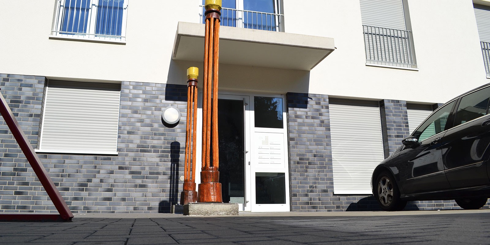 Der Neubau besteht aus einem quer zum Park gelegenes Gebäude mit Satteldach sowie eines 2 ½ geschossigen Anbaus mit Flachdach. Verbindendes Element ist hier der Eingangsbereich der KiTa. Highlight sind die 2 Wohnungen, welche sich im Flachdachbau befinden. Diese sind für Familien geeignet und verfügen Beide über eine große Dachterrasse, die einen Blick in den den Humboldtpark bietet.
