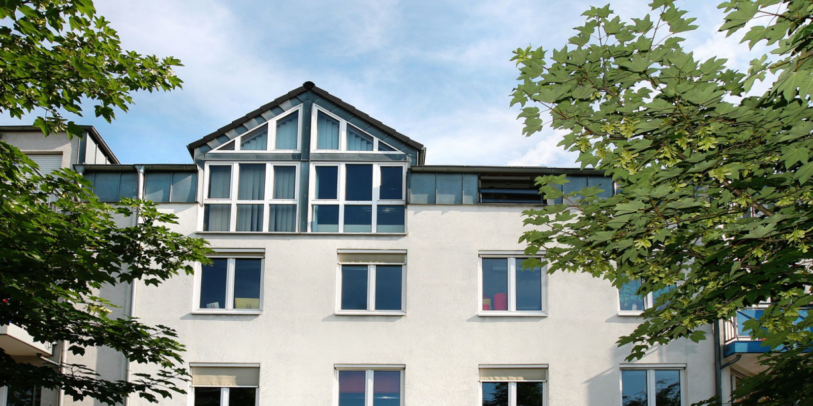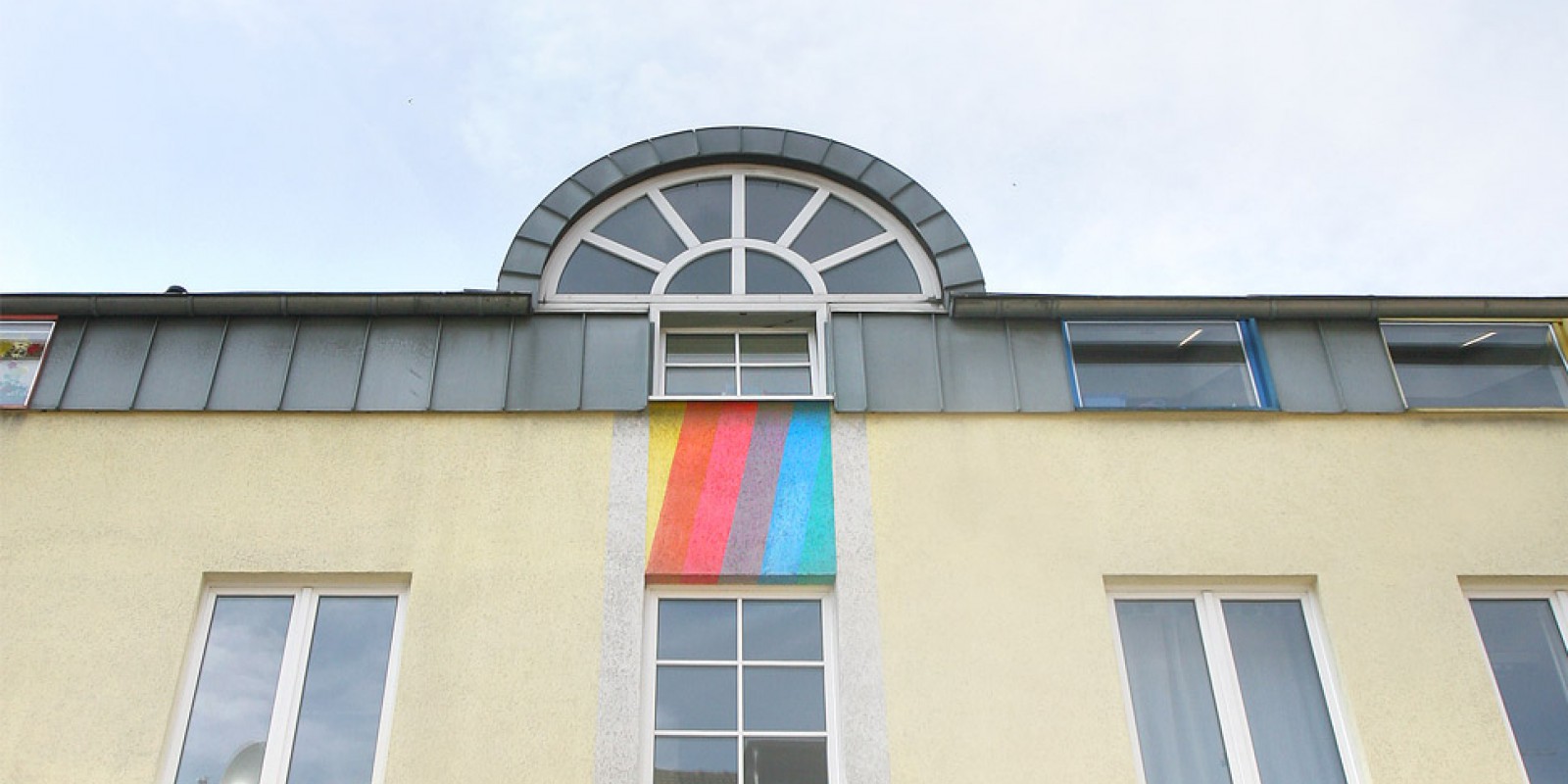 In Köln-Mülheim haben wir in der Holweider Straße gleich zwei Projekte realisiert. In Hausnummer 38 befindet sich das Zentrum für Frühbehandlung und Frühförderung e.V., in der Hausnummer 36 ein Wohnhaus für Jugendliche. Beide Häuser wurden innen wie außen farbenfroh gestaltet – ein fröhliches, helles Gelb und ein optimistisch stimmender Regenbogen prägen die Fassade des neuen Therapie-Hauses, und auch im Inneren dominieren Licht und Farbenfreude. Sogar der Fahrstuhlschacht ist bunt bemalt.