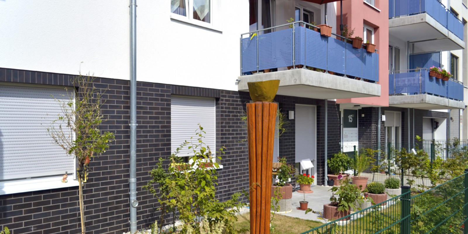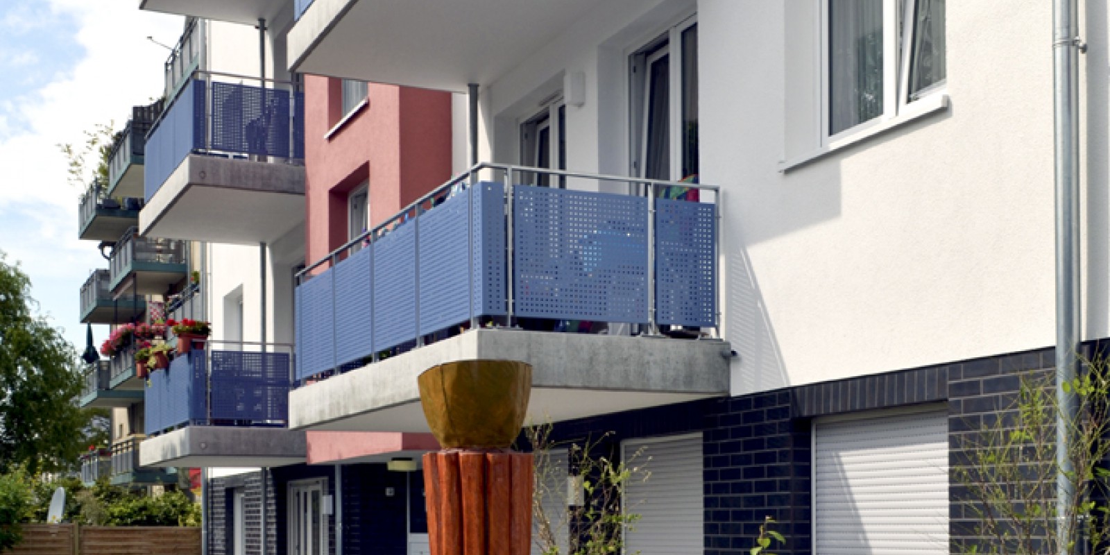 Ein „Highlight“ sind die an der Gartenseite liegenden Kinderzimmer mit Eckfenster. Die niedrige Brüstung bietet selbst den ganz Kleinen einen Ausblick in den Garten und die dahinter liegende KiTa. Die hellen Treppenhäuser mit der in jedem Geschoss unterschiedlichen Architekturkeramik sowie die 3 Eichenstehlen der Künstlerin Nicola Dormagen im Außenbereich verleihen dem Gebäude seinen individuellen Charakter.